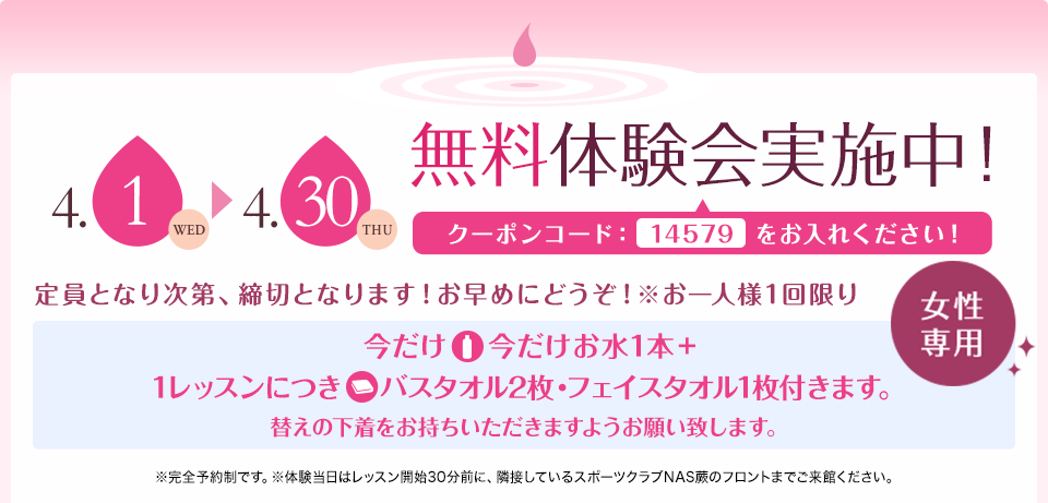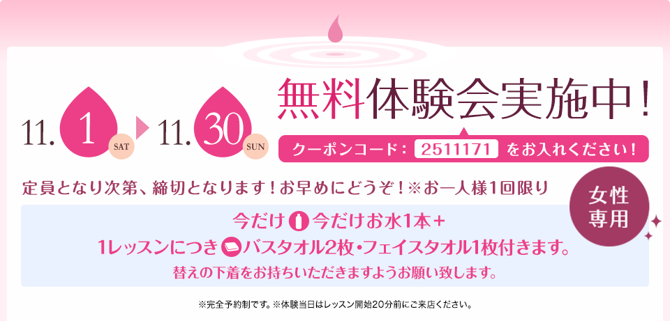 | 1レッスン(有効期限1ヵ月) バスタオル1枚つきます。 |